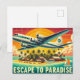 Here’s an enhanced vintage travel postcard featuring a sleek aeroplane flying over a tropical island with golden beaches, palm trees, and turquoise waters, now with more island details. ✈️🏝️🌅 The scene includes a luxury resort with cabanas, sailboats near the beach, and colourful coral reefs visible through the clear water. The bold 1950s-style typography reads "Escape to Paradise.