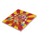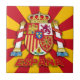 The national coat of arms of Espana (Spain), plus the country name, are designed in a perspective form. These images are in the center of a starburst background, which is made with the colors of the Spanish flag.