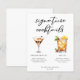 This chic signature cocktails menu sheet features simple black tyopgraphy above 2 drinks and their ingredients for your wedding bar. An espresso martini and Mai Tai drawing add a cool flair to your bar menu. Complete with the couple's names and date for their reception.