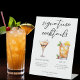 This chic signature cocktails list features simple black tyopgraphy above 2 drinks and their ingredients for your wedding bar. An espresso martini and Mai Tai drawing add a cool flair to your bar menu. Complete with the couple's names and date for their reception.