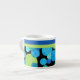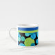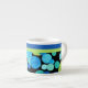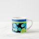 An Espresso Coffee Mug with a pattern of blue and green 'moons on a black background, from a handpainted paper collage by Judy Adamson.
