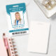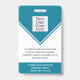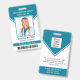 This personalised turquoise ID badge includes an employee photo, name, title, hospital/company name, location, employee ID number, and barcode. Background features turquoise and white. Back of badge features your logo and additional custom text fields for return information or other details. Perfect for medical or corporate facilities who need security identification.