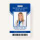 This personalised blue ID badge includes an employee photo, name, title, hospital/company name, location, employee ID number, and barcode. Background features blue and white. Back of badge features your logo and additional custom text fields for return information or other details. Perfect for medical or corporate facilities who need security identification.