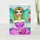 Congratulations Card beautiful illustration done in mixed media of a beautiful blonde girl and female, sitting in the middle of a natural fantasy landscape. Dress elegant violet dress, wearing gloves of the same colour and a fan in hand.