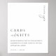 This cards and gifts sign features a modern calligraphy script heading and minimalist design. The script text heading is an image that cannot be edited. The heading image can be resized to fit any poster size. All of the other text is fully editable. For more advanced customization of this design, simply select the "Customize It" button above.