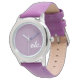 This simple, numberless watch features the abbreviation for "et cetera" (latin: and the rest) in white script text on a plain lavender background colour. It's stylish, artsy, fashionable, etc.