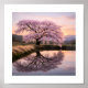 Inspired by a spring scene in Fukushima, Japan, this artwork captures the quiet beauty of sakura reflected on still water, surrounded by gentle hills and fading evening sky.