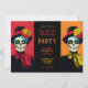 The invitation for the Dia de los Muertos party features a vibrant design with a split background in orange and black, symbolising the traditional colours of the celebration. Central to the invitation are two stylised skulls adorned with top hats, flowers, and ribbons, reflecting the festive yet respectful tone of the holiday. The skulls face each other, adding a symmetrical aesthetic to the design. This invitation is customisable, allowing for personalised event details. More text space at the back