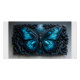 A breathtaking ceramic artwork presented as a detailed sculpture, intricate relief tile, or exquisitely painted pottery form. The central subject is a large, mystical butterfly with expansive wings that shimmer in deep blues, blacks, and luminous teals. Its intricate patterns are defined with fine incised lines, sgraffito, or mishima inlay techniques, while crystaline, iridescent, and translucent glazes create a striking bioluminescent glow. The sculpted body is detailed with naturalistic segmentation, bringing lifelike presence to the creature. Surrounding the butterfly, a dark, enchanting forest emerges in low relief, with trees and foliage rendered in textured clay and finished with matte glazes of deep blue, gray, and black. Subtle glaze blending and surface textures evoke an ethereal, misty atmosphere, enhancing the dramatic interplay of light and shadow. The piece is both enchanting and profound, a masterful fusion of sculptural detail, glaze artistry, and narrative depth.