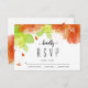 Ethereal orange flowers floral fall wedding RSVP card. The upper part is covered with a bouquet of beautiful orange flowers with green leaves.