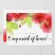Ethereal red flowers and cursive script style handwritten calligraphy floral spring wedding "Will you be my maid of honour?" card. This beautiful design showcases red and pink flowers with green leaves.