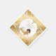 Baby girl in christening dress with gold cross necklace sleeping on a pillow. Background is gold with silver scroll work.