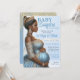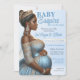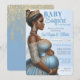 Soft illustration of a breathtakingly stunning Royal African Mother to Be wearing elegant Blue and Gold gown with sparkling gold crown and dazzling jewels as she cradles her growing baby bump in anticipation for the royal arrival. Customise for single or couple's shower.