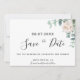 A modern Save the Date card for a wedding. A chic white background decorated with green watercolored eucalyptus greenery, leaves and sprigs and a watercolored white peony, flower floral. Personalise and add your names, the date and place of the venue. Black coloured letters. The text: Save the Date is written with a large trendy hand lettered style script.