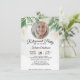 Foliage of eucalyptus leaves combines with glitter fold leaves. The design is so elegant and modern that features a Golden and Bluish accent style with gold lines that complement the design. Also, there is a chic frame of beads where you can add your photo to make the invitation extra special and customisable.