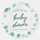 This baby shower sticker features eucalyptus leaves with the words "baby shower" in trendy script all against a pale marble background.