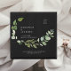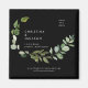 Modern Botanical Watercolor Wedding Save the Date. Square. White text. Magnet. Black background.