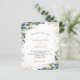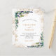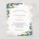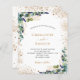 A white background decorated with eucalyptus greenery and golden foliage. Personalise and add your names and wedding details. Black and golden coloured letters.