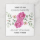 This sophisticated wedding escort place card showcases a beautiful arrangement of an eucalyptus branch adorned with delicate pink rose flowers and soft sage green foliage at the top. The names are elegantly inscribed in a stylish decorative font, adding a touch of charm to the overall design.