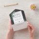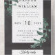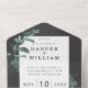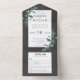 All in one tri- fold wedding invitation featuring Eucalyptus on a watercolor charcoal grey background. Wedding invitation, rsvp card and envelope combination.