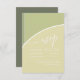 With a colour palette from ivory to spring green and dark moss, this wedding collection features a handwritten script font and eucalyptus leaf accents to add that wonderful modern touch. The RSVP card shown here in vertical format, has all the above with a striking striped pattern in shades of green topped by an elegant curved shape in coordinating flax gold. Add your preferred text using the provided template. Search ID901 to see other colour choices and coordinating pieces for this unique wedding collection.