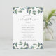These simple and trendy botanical wedding rehearsal dinner invitations feature green watercolor eucalyptus leaves and foliage on a minimalist white background with modern handwritten script.
