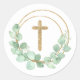 A gold faux glitter cross and eucalyptus leaves wreath are featured on these round stickers. Perfect for your child's baptism, christening or first communion. MATCHING items available in our collection.