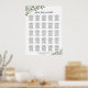 This 25 table wedding seating chart is rustic, stylish, and beautiful. It features a hand painted boho chic design with watercolor eucalyptus leaves, greenery, and garden foliage in shades of mint moss and sage green. The lacy script calligraphy title reads: Please find your table, and the names of the couple and wedding date appear at the bottom. This traditional chart has seating assignments for 250 guests with 10 seats per table.