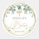 Elegant greenery round Sticker for Baptism celebration. This design features an illustration of Eucalyptus foliage in watercolor style and faux gold cross.