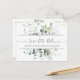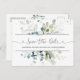 This design features a watercolor illustration of eucalyptus foliage. Text "Save the date" is written in a Script font with joined hearts. On the top of the card - golden and greenish effect confetti.