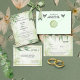 Your romance is evergreen. This vibrant wedding invitation features a faux metallic frame with painted eucalyptus leaves in the corners over a watercolor background. Within the frame, your names and wedding details are displayed in elegant fonts. On the back, eucalyptus foliage fills the light green space, creating a feeling of calm and continuity. Some images are also removable.