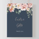 This eucalyptus garden rose floral cards and gifts sign is perfect for a rustic wedding or bridal shower. The design features pink, blush, yellow rose flowers with eucalyptus leaves in a dark navy blue background.