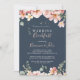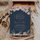 This eucalyptus garden rose floral wedding breakfast invitation is perfect for a modern event. The design features pink, blush, yellow rose flowers with eucalyptus leaves in a dark navy blue background.