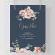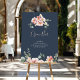 This eucalyptus garden rose floral wedding open bar poster is perfect for a rustic wedding. The design features pink, blush, yellow rose flowers with eucalyptus leaves in a dark navy blue background.