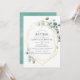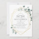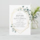 Trendy watercolor eucalyptus silver dollar baptism, christening or dedication invitation with gold geometric frame.