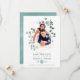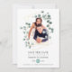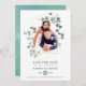 Trendy watercolor eucalyptus silver dollar wedding save the date photo cards with gold geometric frame.