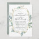 Wild forest woodland eucalyptus herbarium long distance baby shower by mail invitation with gold geometric frame and silver sage watercolor wash reverse.