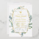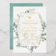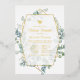 Wild forest woodland eucalyptus herbarium long-distance baby or bridal shower by mail invitation with gold geometric frame and silver sage watercolor wash reverse.