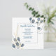 Simple and classy, these wedding invitations are the perfect way to invite all of your friends and family to your big spring or summer big day celebration. Features hand-painted blue watercolor eucalyptus branches with gold leaves on the front. The back is a solid blue background with gold foliage. All blue typography is customisable to fit all of your wedding day celebration needs.