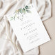Beautiful Save the date card featuring watercolor eucalyptus and gold leaves with modern script.