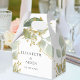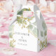 Elegant wedding favor box adorned with watercolor eucalyptus leaves and delicate gold floral accents. The green, gold, and ivory color scheme makes it ideal for rustic chic, garden, or modern botanical weddings. Personalize it with your names and date for a cohesive finishing touch to your celebration.