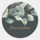 Add a touch of effortless elegance to your wedding details with this round sticker, featuring a delicate watercolor illustration of a eucalyptus branch and soft green leaves. The botanical design evokes garden serenity and natural charm, perfectly framing the names of the happy couple in beautiful gold handwritten script against a rich, dark background.