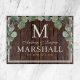 Rustic dark brown wood with eucalyptus greenery cutting board with the couples first names, last name monogram, full last name, and wedding date available in customizable templates. A cute country barbecue themed gift to help celebrate a summer wedding cookout.