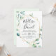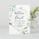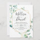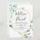 Wedding Invitation featuring hand-painted mint green watercolor eucalyptus leaves adorned by a modern white gold geometric frame.