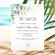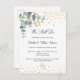 A chic white background. Decorated with green watercolored eucalyptus leaves, sprigs, greenery and a faux gold sprig. Golden hearts sprinkle. Personalise and add your names and ceremony details. Black letters.