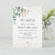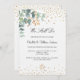 A chic white background. Decorated with green watercolored eucalyptus leaves, sprigs, greenery and a faux gold sprig. Golden hearts sprinkle. Personalise and add your names and ceremony details. Black letters.