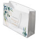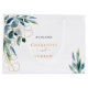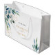 A chic white background. Decorated with watercolored eucalyptus greenery, and golden foliage. Personalise and add a date and the name of the bride and groom. Grey and golden text.