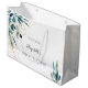 A chic white background. Decorated with watercolored eucalyptus greenery, and golden foliage. Personalise and add a date and the name of the bride.