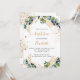 A white background decorated with eucalyptus greenery and golden leaves and faux gold glitter drops. Personalise and the childs name and ceremony details. Black and golden coloured letters.