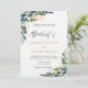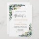 A white background decorated with watercolored eucalyptus greenery, lavender florals and golden foliage. Personalise and add your names and wedding details. Black and golden coloured letters.